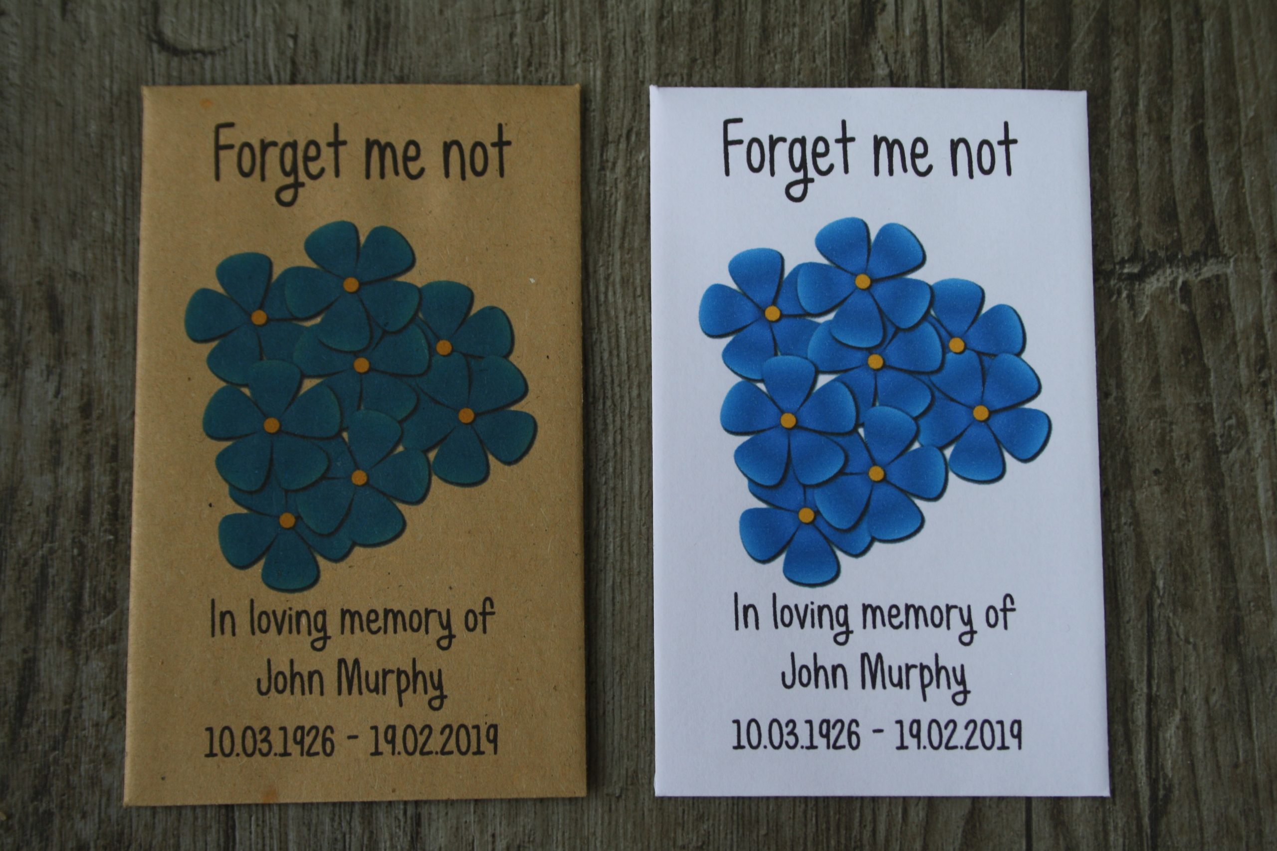 The top of the packets will have Forget Me Not and the bottom of the packets will have the name and date