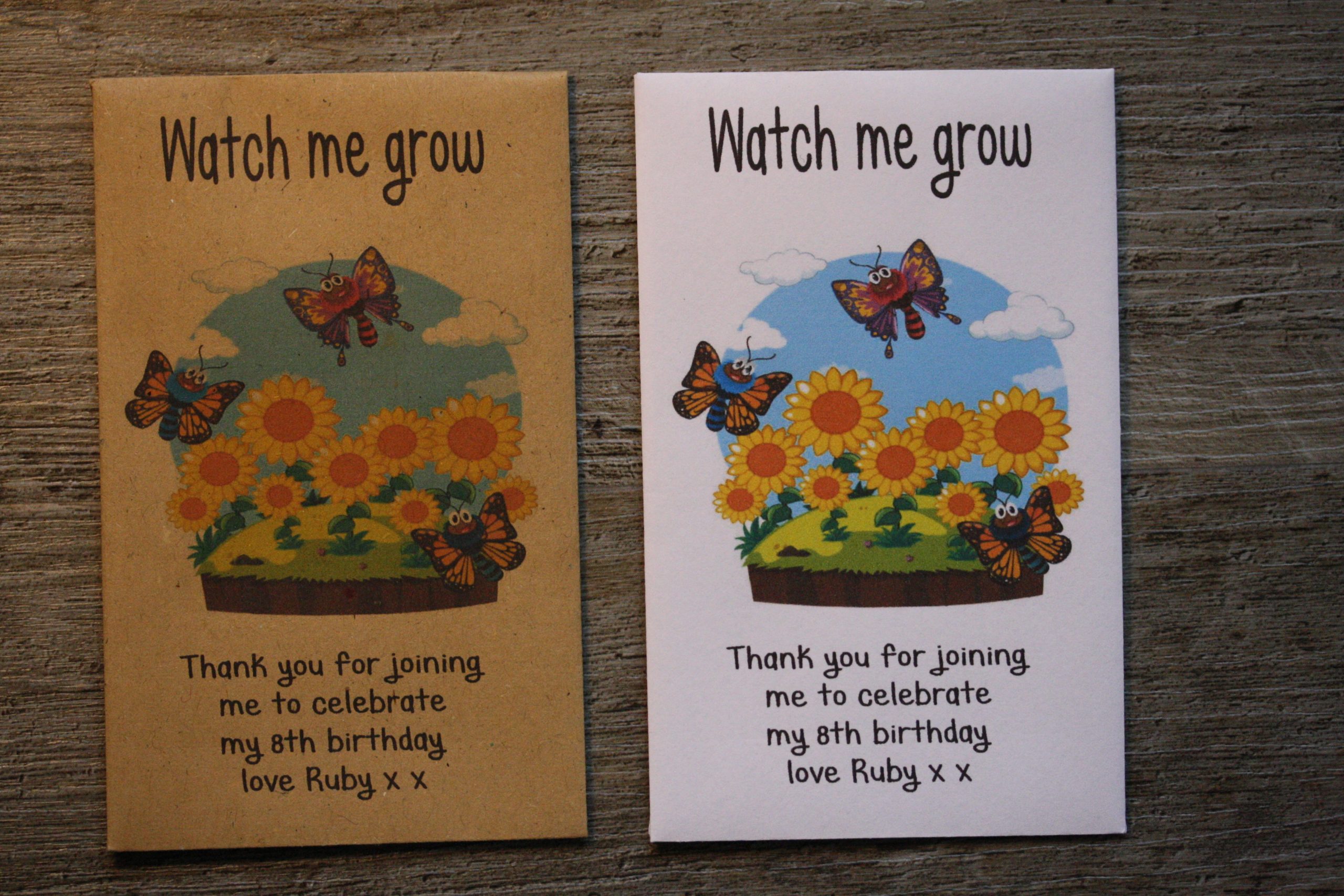The top of the packets will have Watch me grow and the bottom of the packets will have your details